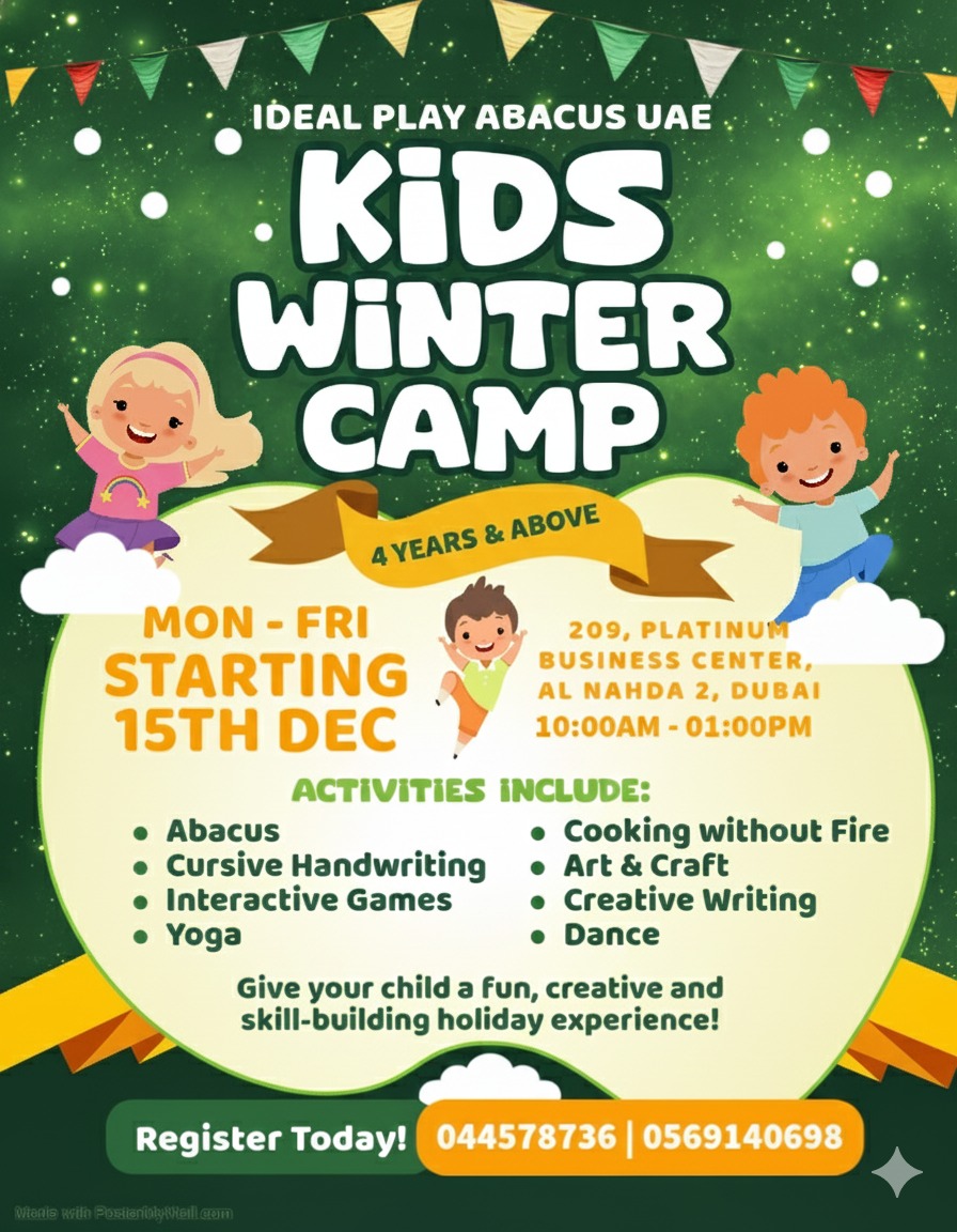 The camp is starts in December and the timings are 10:00 am to 1:00 pm. Loads of activities for children to learn while having fun!
